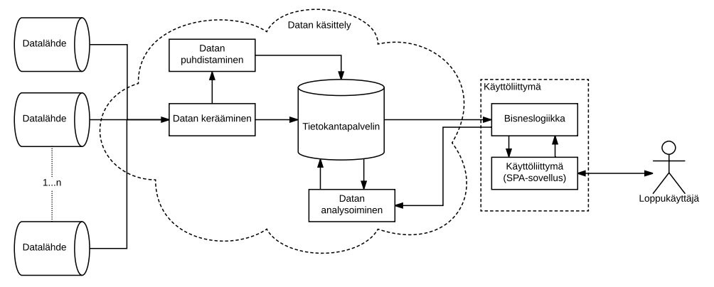 - Sovelluslogiikan koostaminen: datan koostaminen, suodattaminen ja muuntaminen (esimerkiksi Google Fusion Tables);